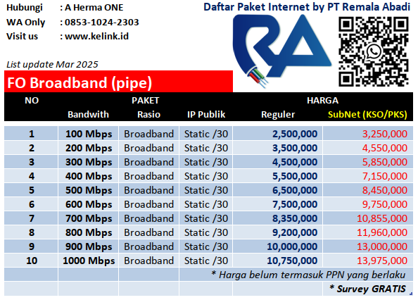 Rasakan kualitas koneksi broadband dengan performa maksimal dan latensi rendah. Didukung infrastruktur modern dan layanan profesional, kami menghadirkan internet yang siap menunjang produktivitas dan hiburan Anda tanpa kompromi.